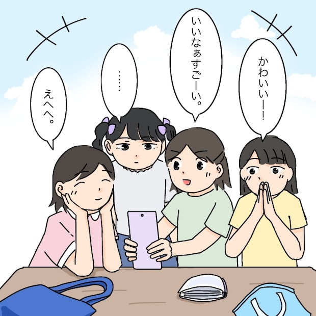 公園に集まると、さっそく新作のうるうるシール鑑賞会が始まりました。「かわいいー!」「いいなぁ、すごーい!」友達から羨ましがられ、あいはどこか誇らしげに微笑みます。そんな中、まりあちゃんだけは言葉を発さず、無表情のまま新作のうるうるシールを見つめていました。