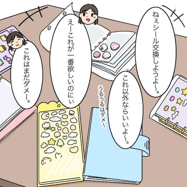 すると友達の1人が、「ねぇ、シール交換しようよ~」とシール帳を広げます。しかし、あいが「うるうるシール以外ならいいよ、これはまだダメ」と答えると、友達は肩を落として「えーこれが一番欲しいのに」と残念そうにつぶやきました。
