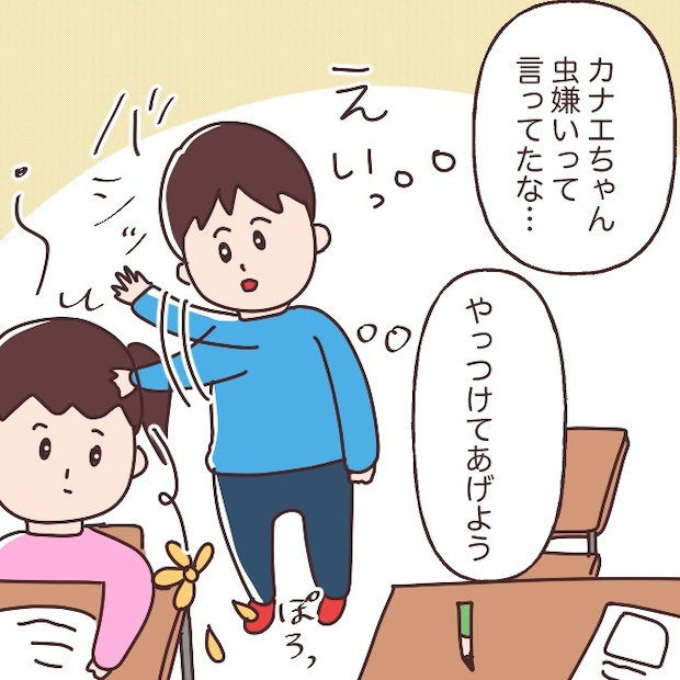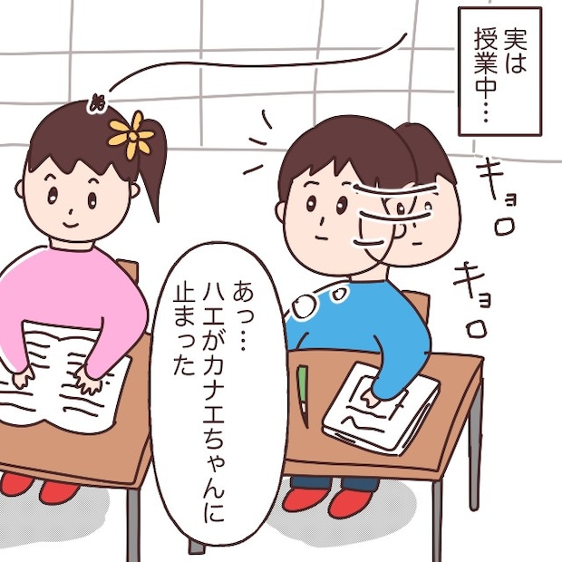 学校の授業中、退屈でつい周りをキョロキョロしていたトウマは、1匹のハエがたまたまカナエちゃんの頭に止まるのを見たそうです。だけどカナエちゃん本人は気付いていない様子。