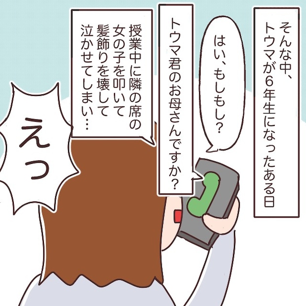 そんな中、トウマが6年生になったある日のこと。この日もまた学校から電話がかかってきました。「はい、もしもし?」すっかり慣れた様子で電話に出ると、「トウマ君のお母さんですか?授業中に隣の席の女の子を叩いて、髪飾りを壊して泣かせてしまい・・・」と担任の先生に言われ、サーッと血の気が引いていくのを感じました。