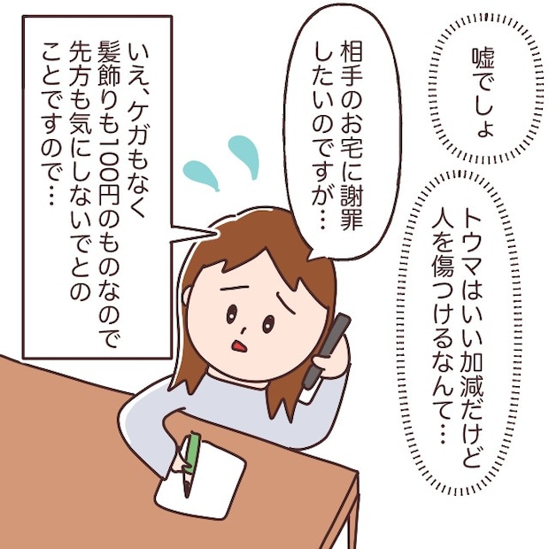トウマはいい加減なところはあるけれど、人を傷つけるなんてこと今までなかったのに。私は慌てて「相手のお宅へ謝罪したい」と先生に伝えます。ところが先生は、「ケガもありませんし、髪飾りも100円のものなので、先方は気にしないでほしいとおっしゃっています」と言います。そうは言っても、このままでは納得できません。私はまず、トウマ本人から話を聞いてみることにしました。