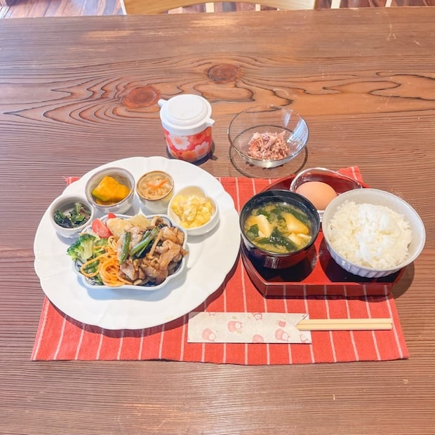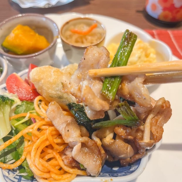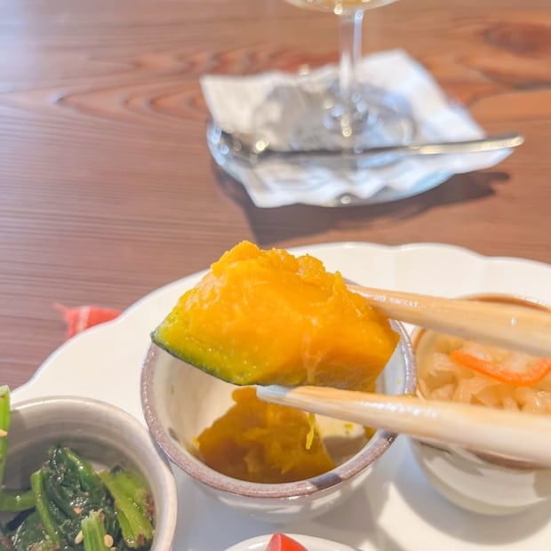 副菜のかぼちゃの煮物はお出汁がじゅわっと染みていて、ほっとする家庭の味。品数豊富でボリュームも満点、心もお腹も満たされる大満足のランチでした。