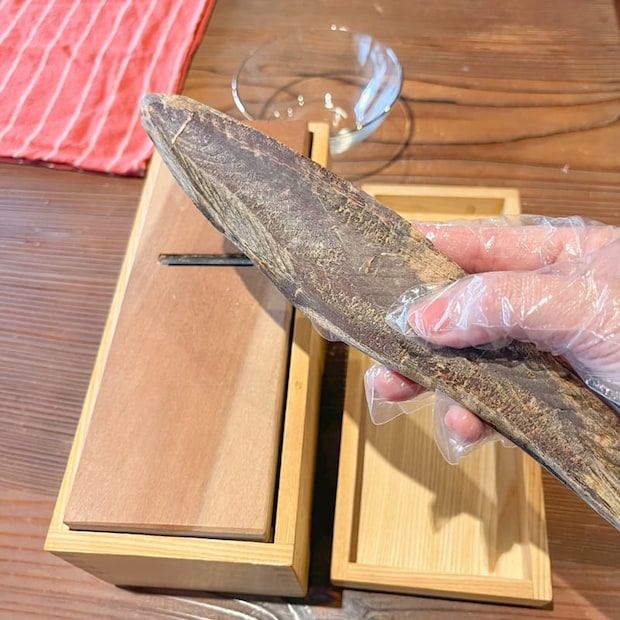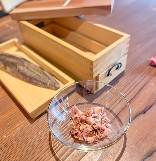 本物の鰹節の塊を見るのも、削るのも初めて。このひと手間が、なんとも贅沢で貴重な経験です。