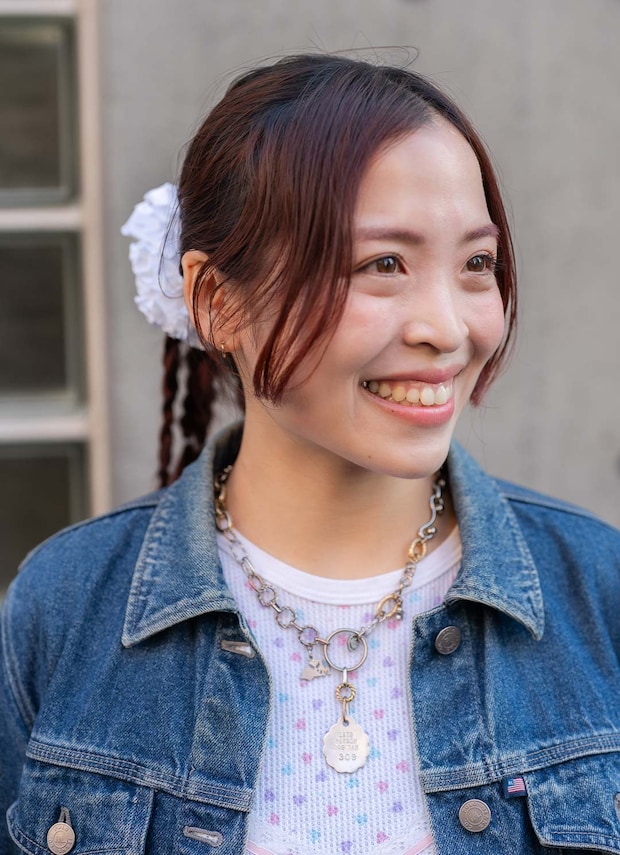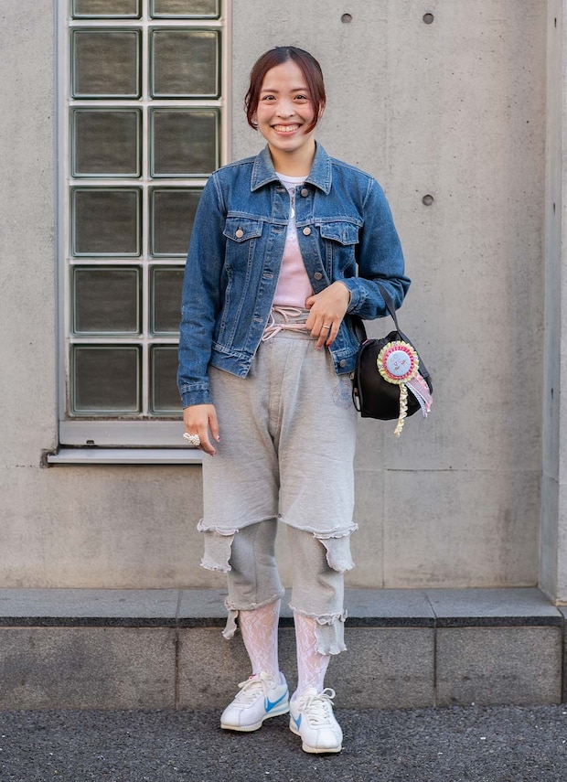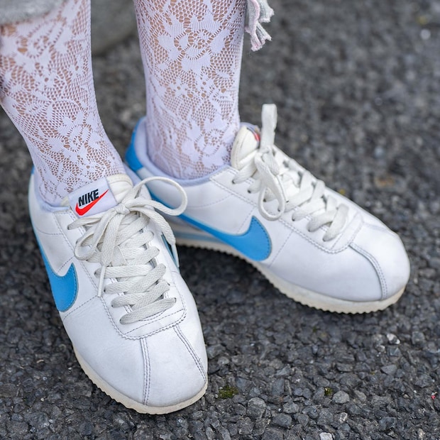 足元は春らしい『ナイキ』のコルテッツにレースソックスを合わせたフェミニンな足もと。