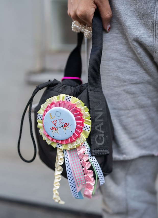 スポーティな『ガニー』のハンドバッグに手づくりのロゼッタをオン。カラフルなリボンが揺れて、ハッピームードを漂わせて♪