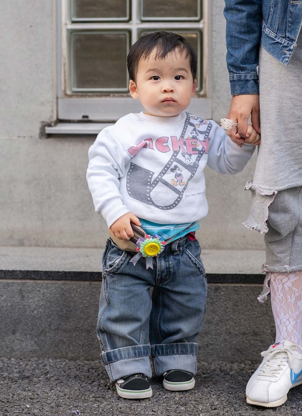 アメリカンブランドでつくる親子コーデは、ヴィンテージアイテムをとことん取り入れて、唯一無二のアメカジスタイルの完成! さらに爽やかな水色を挿し色に、ママ手作りのロゼッタを添えて、統一感たっぷりの春の装いにアップデート♪
