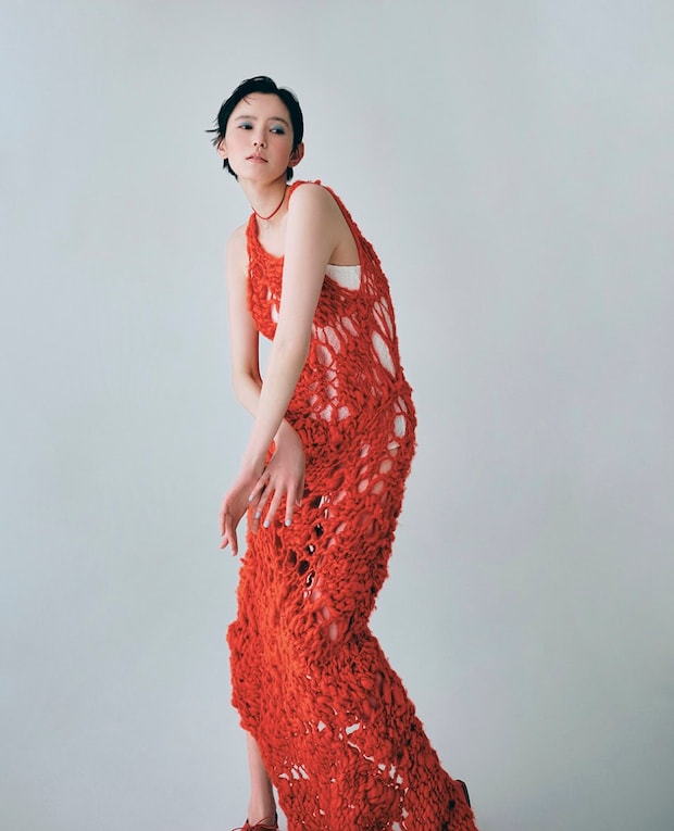 ドレス¥220,000(KAKAN)、チョーカー¥33,000(カラットアー/イセタンサローネ東京)、靴¥24,200(オデット エ オディール/オデット エ オディール 新宿店)、インナーはスタイリスト私物