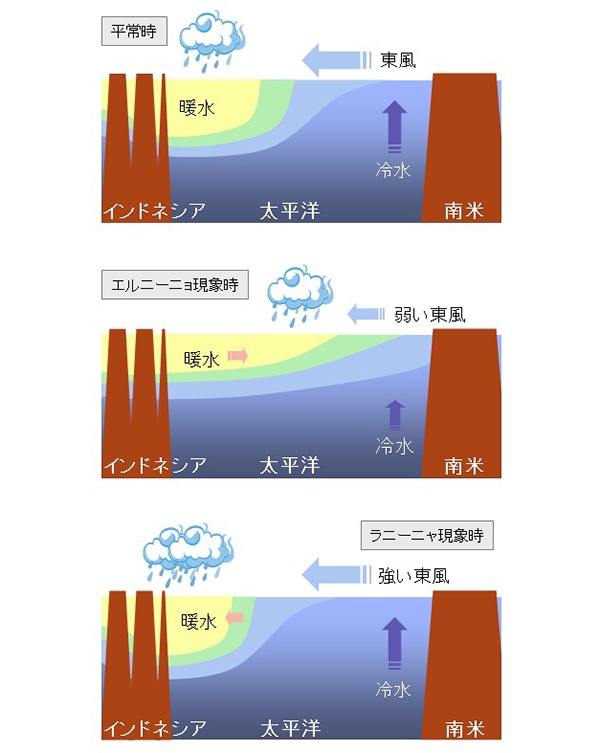 なお、これとは逆に、東風が平常時よりも強く吹いて西側に暖かい海水がより厚く蓄積し、東部で海面水温が低くなる現象をラニーニャ現象と呼びます。