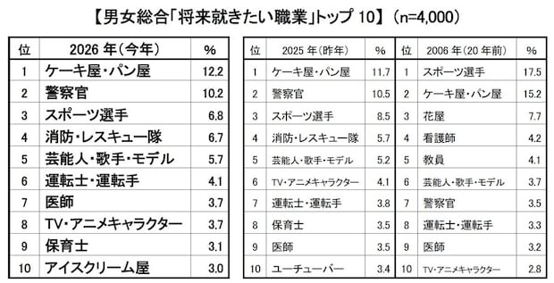 20年前との比較では、当時多くの男の子の憧れだった「スポーツ選手」が10.7ポイント減らして1位から3位に。男女両方で人気が高まっている「警察官」が6.7ポイント増やして7位から2位に上がりました。11位だった「消防・レスキュー隊」も3.9ポイント増やして4位に入り、人を助ける仕事への関心が高まっていることがうかがえました。