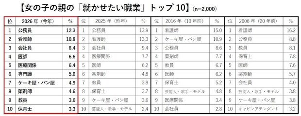 女の子の親の「就かせたい職業」トップ10(n=2,000)