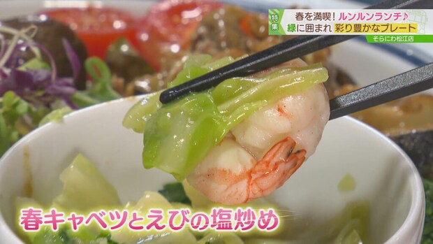 副菜の春キャベツとえびの塩炒めも、春キャベツがシャキシャキで美味しい♪