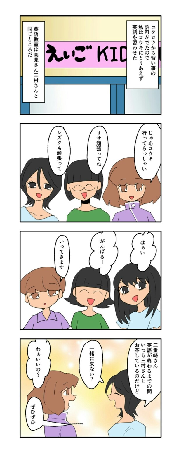 ハルミは息子のコウキを、高見さんや三村さんの子どもと同じ英語教室に通わせました。英語教室の初日、高見さんから「英語教室が終わるまで一緒にお茶をしませんか」と誘われ、3人でお店に向かいました。
