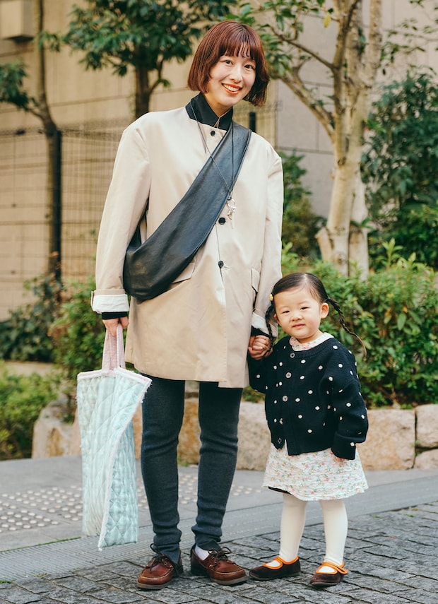 「パリジェンヌのようなスタイリッシュな雰囲気ですね。シンプルな色合わせだけど、アイテムのサイズ感などのバランスが絶妙でおしゃれ。キッズはドット柄と花柄の合わせが可愛いです。オレンジが効いている靴で引き締まっていますね。ママのボトムスは、パンツじゃなくてニットレギンスを合わせているところが、スタイリングに強弱がついてグッド!」