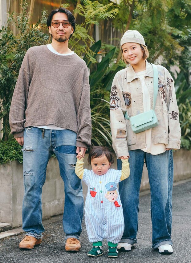 「パパ&ママのコーデのトーンやスタイルがあっていますね。ベージュとデニムの合わせがやさしい印象です。キッズはブルーやイエローをまとったポップなムード。家族の主役になっていますね。レトロなワッペンが楽しい雰囲気で効いています!」