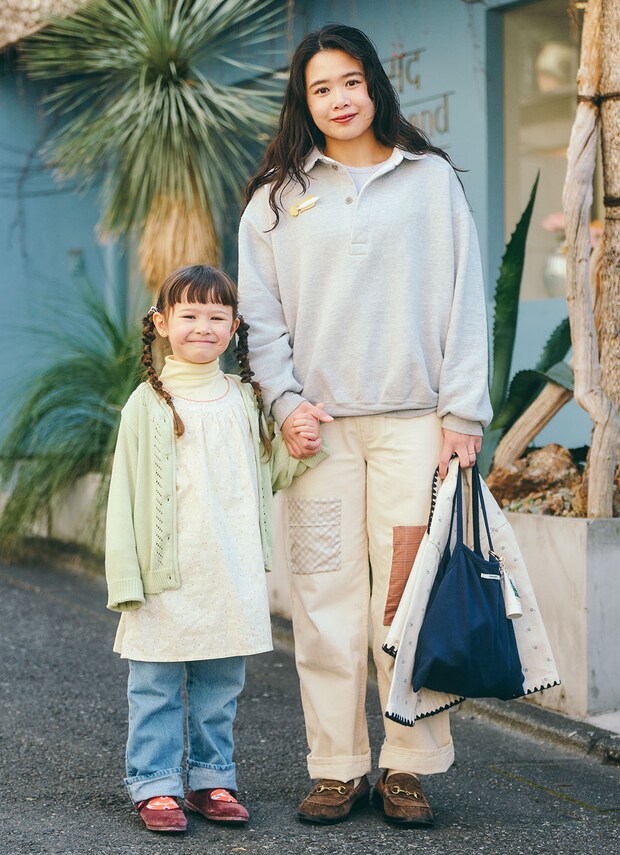 「一見シンプルだけど、ママのパンツにパッチワークがあったり、お魚のブローチがついていたりと、すごく小技が効いたスタイリングですね。自分らしい着こなしが素敵です! キッズはイエロー×グリーンの色合わせが春らしくて可愛い♡ 柄の靴下もワンポイントになっていて、コーデ全体が引き締まっていますね」