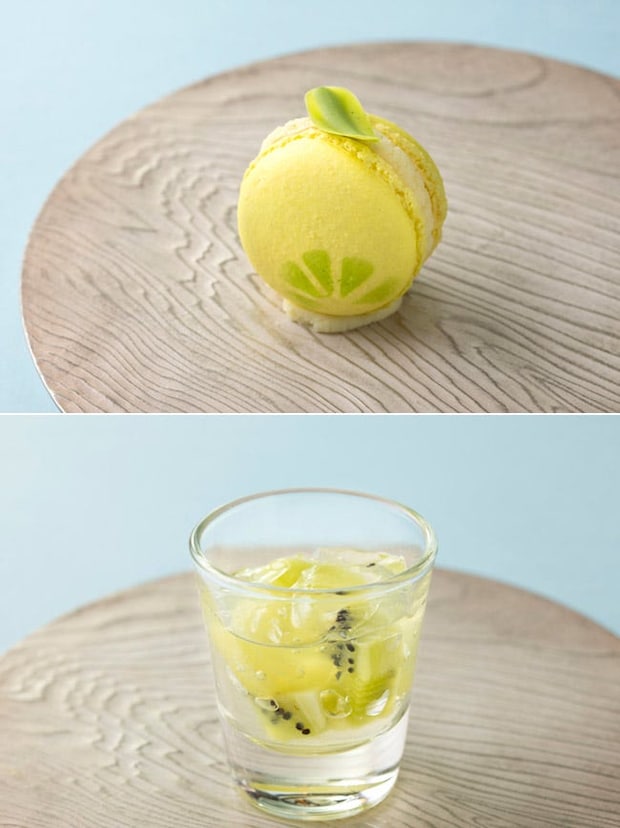 ライムがふんわり香る「ライムとホワイトチョコレートのマカロン」は、ホワイトチョコレートのまろやかな甘さに、爽やかな酸味が重なる大人な味わい。また、「キウイフルーツとメロンのジュレ」は宝石のような透明感が目にも鮮やか。みずみずしい果肉の食感と、すっきりとした余韻を楽しんで。