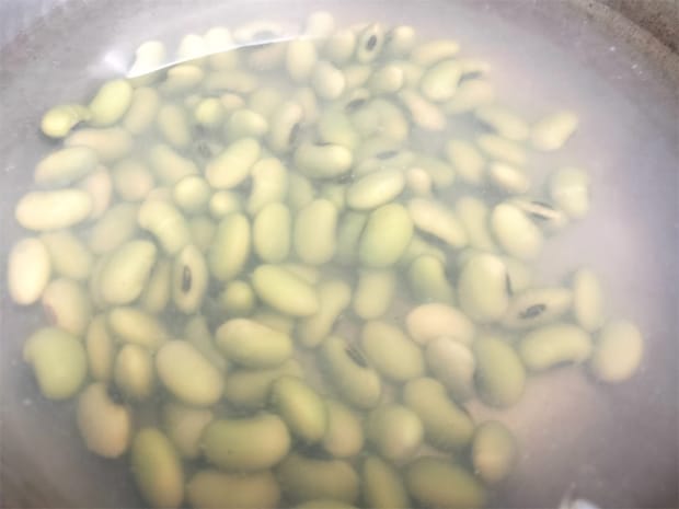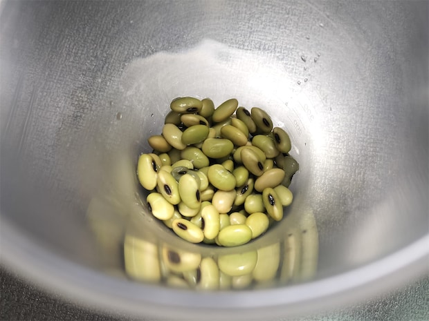 1. 鍋にお湯(分量外)を沸かし、青大豆と少量の食塩(分量外)を入れて再度沸騰したら3~4分茹で、ザルにあげて粗熱を取ります。