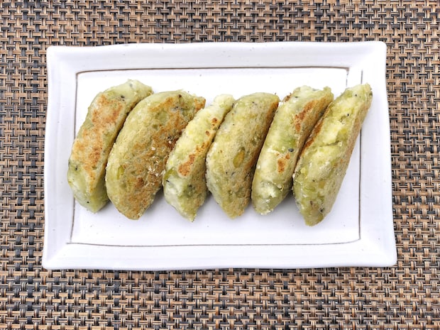 豆は茹でていますが、米粉ともち粉は生のままです。消化不良をおこしたりしないのでしょうか…。記事に「油をひいたフライパンで両面に焼き目をつけたもの」と、「油でこんがり揚げた」食べ方が紹介されていたので、フライパンで弱火で焼いてみることにしました。