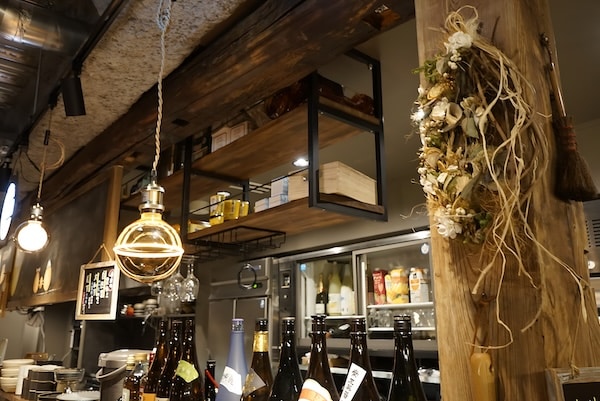 ドライフラワーが随所に配置され、チョークアーティスト「MIKI」氏による山芋アートや、こだわりの照明でスタイリッシュでありながらどこか懐かしく落ち着く空間が演出されている。
