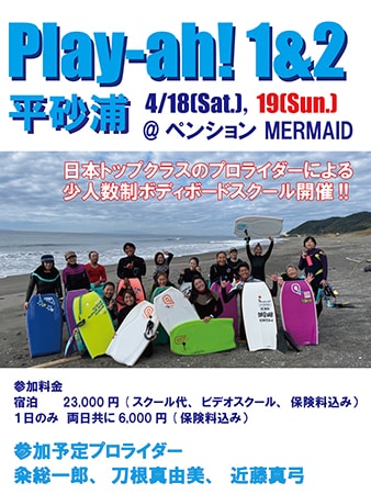 ライクスは、千葉県館山市の平砂浦海岸にて、初心者から経験者までレベルを問わず上達できるボディボードイベント「play-ah!」を、4月18日(土)・19日(日)に開催する。