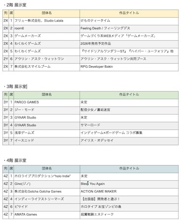 公式サイトに出展団体の一覧が公開された。企業は、ホロライブプロダクション ”holo indie”やわくわくゲームズなどが出展。