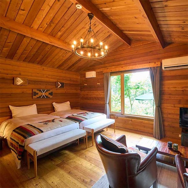 客室はグランピングができるテントキャビンから、北欧風のコテージまで揃い、好みのタイプから部屋を選べる。乳幼児連れにおすすめなのは、「テラスハウス」。ログハウスにはバスルームやトイレを備えているので、快適にアウトドアを楽しめる。デッキテラスでBBQを満喫した後は、宿泊者限定の森を望む露天風呂でリフレッシュするのもおすすめ。