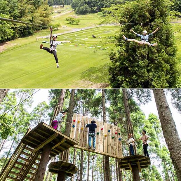 滞在期間中は、自然共生型アウトドアパーク「フォレストアドベンチャー・ターザニア」で、関東最長のジップスライドを滑り降りる「ロングジップスライド」や、樹から樹へ空中移動を楽しむことで子供の自立心を養う「ターザニア」など、森のアクティビティを体験できるのが注目のポイント。専用ハーネスで安全性ばっちりの「キッズコース」は、宿泊ゲストは無料で利用できる。