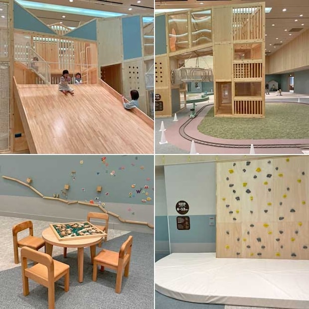 全天候型アクティビティ施設「杜の8(もりのえいと)」は、八ヶ岳の山々からインスパイアを受けた遊具があり、天気に左右されず子供を思いっきり遊ばせることができる。