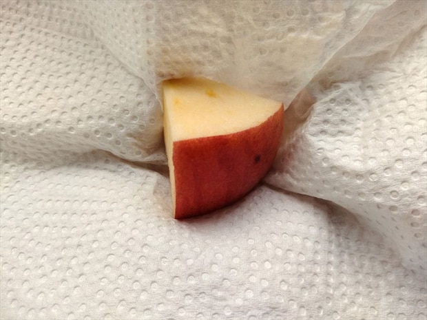 その1:フルーツの水分をしっかり拭きとる。特に、カットしたフルーツ(パイナップル、キウイ、りんご)は水飴を絡める直前にもう一度水気を拭きとる。
