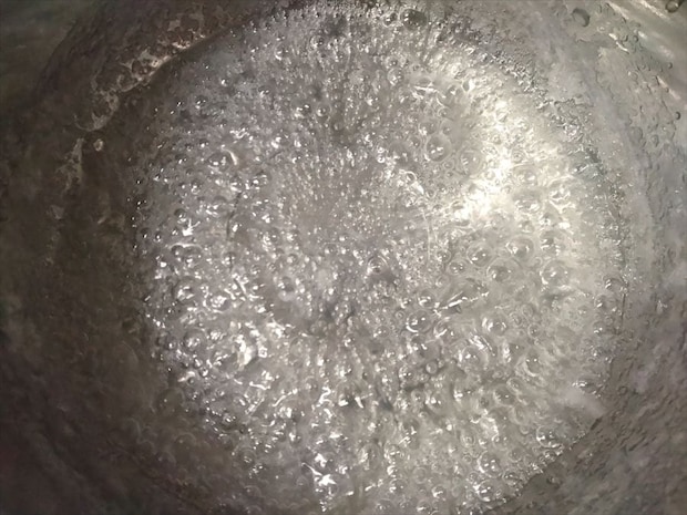 泡が大きくなり、粘り気が出てきたところで、スプーンで少しすくって氷水に落としてみます。