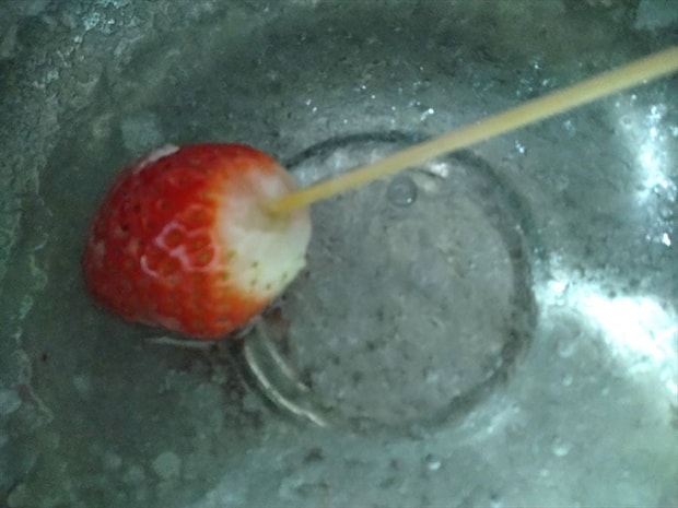 2. 1のフルーツの水気をキッチンペーパーでしっかり拭きとって、竹串に刺す。