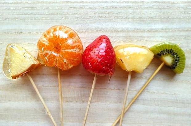 カットしたフルーツの表面からは水分が出やすく、飴が固まりにくいとのこと。