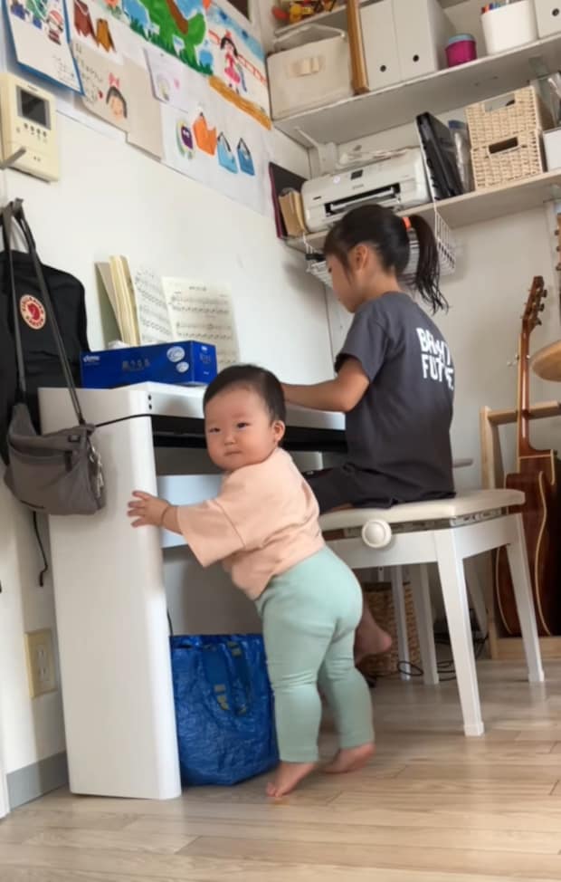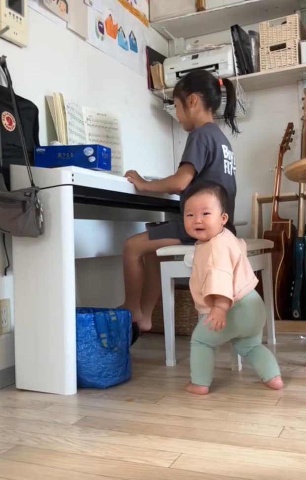 お姉ちゃんのピアノに反応して可愛らしいダンスを踊る赤ちゃん。とっても楽しそうな表情に注目です♡
