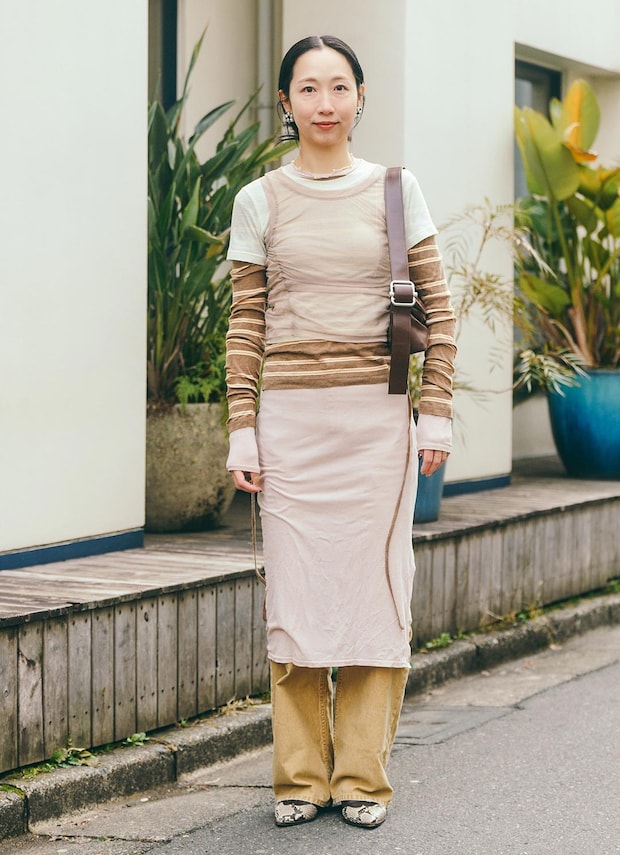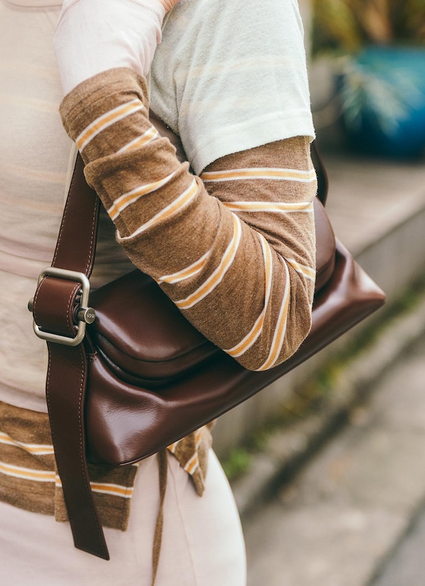 『オソイ』のイーストウエストバッグでレディなエッセンスをひとさじ。ブラウンレザーで全体を程よく引き締めて。