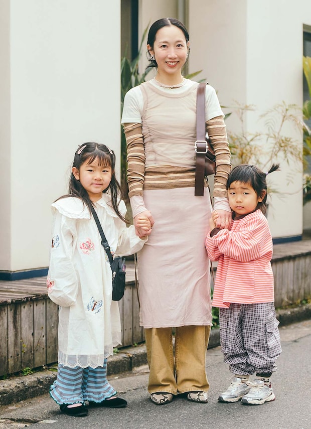 今季注目のボーダー柄でゆるやかにリンクしたファミリーコーデが、リズミカルさで春ムード満載! ママのシースルートップスにTシャツをを組み合わせた、最旬のレイヤード術はぜひお見逃しなく。