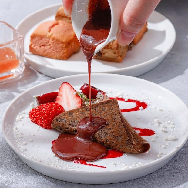 スペシャルディッシュは、ブーケのように可憐な「チェリーとショコラのクレープブーケ」。カスタードとチェリーコンフィチュール、なめらかなダークチョコレートのシャンティを包み込んだココアクレープに、フレッシュフルーツを添え、華やかな見た目に仕上げられている。