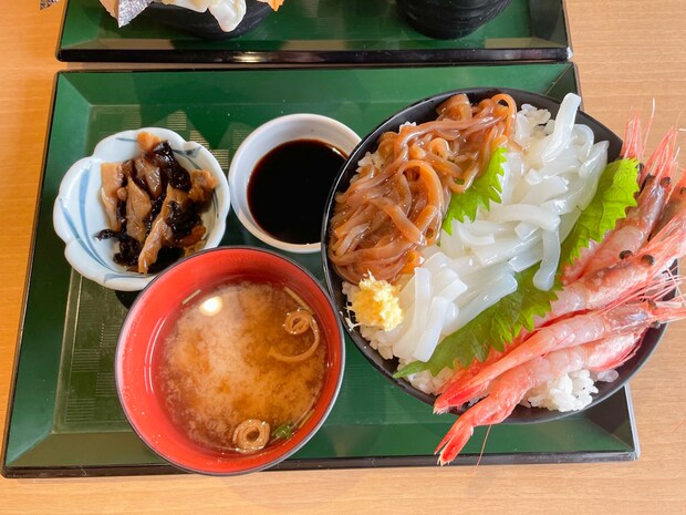 続いていただいたのは、鳥取県賀露港産の白いか、境港産のするめイカの醤油漬け、甘えびが乗った「三色 白いか丼」です。こちらもセットでお味噌汁と小鉢が付いています。