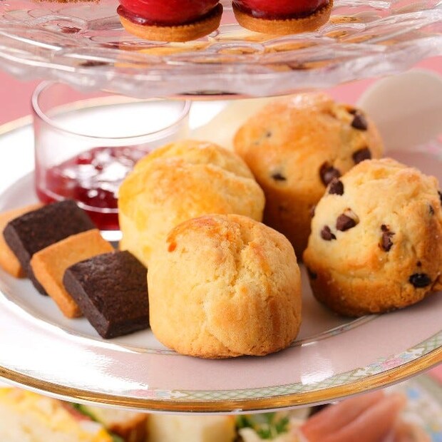 中段には、王道の「プレーン」と、バラのエッセンスを加えた「バラ&チョコチップ」の2種類のスコーンのほか、バターの香りが広がる「チョコ」と「バニラ」のサブレを用意。シンプルながらも素材のよさが際立つベイクドスイーツをお好みの紅茶と一緒にどうぞ。