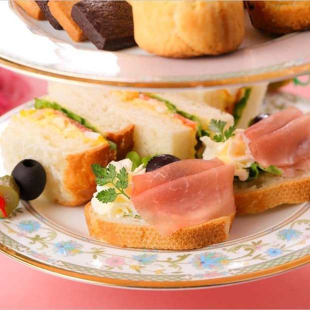 スイーツの合間にうれしい下段のセイボリープレートには、ほどよい塩気がチェリーの甘酸っぱさを引き立てる「チェリー&マスカルポーネと生ハムのオープンサンド」や「トラウトサーモン&玉子のサンド」が並び、ティータイムにより彩りを添えてくれる。