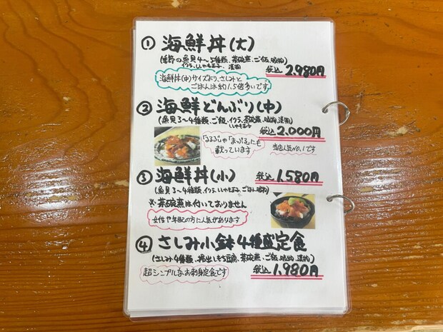 海鮮丼やお刺身定食、煮付けといった海鮮メニューのほか、チキン南蛮やハンバーグ定食など、幅広いメニューが揃っています。