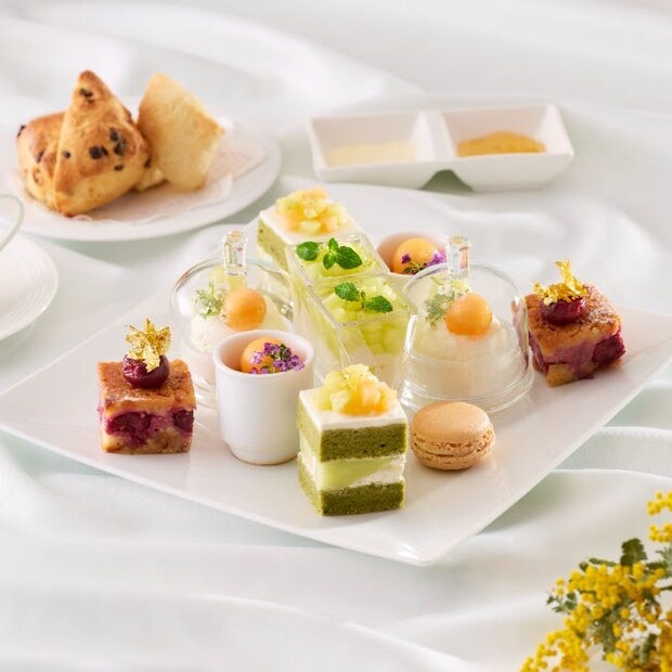 スイーツには、フロマージュブランとサワークリームを合わせた軽やかなクリームにメロンの甘みを重ねた「メロンのクレームダンジュ」をはじめ、杏仁豆腐の優しい甘みとライムの爽やかな香りがメロンのみずみずしさを引き立てる「メロンと杏仁豆腐」、抹茶の奥深い風味とメロンの上品な甘みが調和する「メロンショートケーキと抹茶のマリアージュ」などが登場。加えて、マンゴーとココナッツを合わせた南国の果実感あふれるプリンや、甘酸っぱいダークチェリーとルバーブのコンフィチュールを重ねたチーズタルトなど、初夏を感じる多彩な味わいが盛りだくさん。