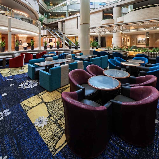 「ホテルニューオータニ大阪」アトリウムロビー中央に位置するのは、空間いっぱいに甘い香りが漂うティー&カクテルラウンジ。4階まで続く吹き抜けから柔らかい陽の光が贅沢に降り注ぐ下で、季節に合わせたテーマで展開するデザートビュッフェが楽しめる。