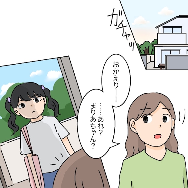 「そうなんだ!わざわざごめんね~誰のお家かな?迎えに行った方がいいよね」そう聞くと、まりあちゃんは「たかこちゃんち、でもお母さんが送ってくれるって」と答えます。私は、あいが帰ってくるまでまりあちゃんと一緒に家で待つことにしました。