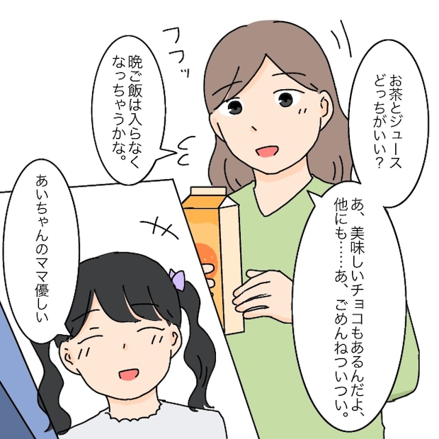 「お茶とジュースどっちがいい?美味しいチョコもあるんだよ、他にも・・・あ、でも晩ご飯入らなくなっちゃうかな」いつもの癖で、あれこれ世話を焼きそうになりましたが時間が時間。晩ご飯のことを考えてジュースを引っ込めようとすると、まりあちゃんは「あいちゃんのママ優しい」と楽しそうに笑いました。