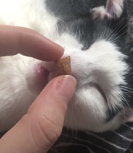 子猫さんの顔の近くに大好きなご飯を一粒、