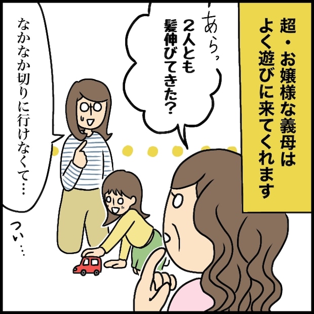 超お嬢様な義母は、よく我が家に遊びに来てくれます。この日も、娘と一緒に遊びながら世間話に花を咲かせていると、ふいに義母が「あらっ、2人とも髪伸びてきた?」と聞いてきました。仕事と家事、そして育児に追われる毎日。なかなか美容院に行く時間も取れず、セミロングだし少しくらい放っておいても大丈夫かな、なんてつい後回しにしていました。