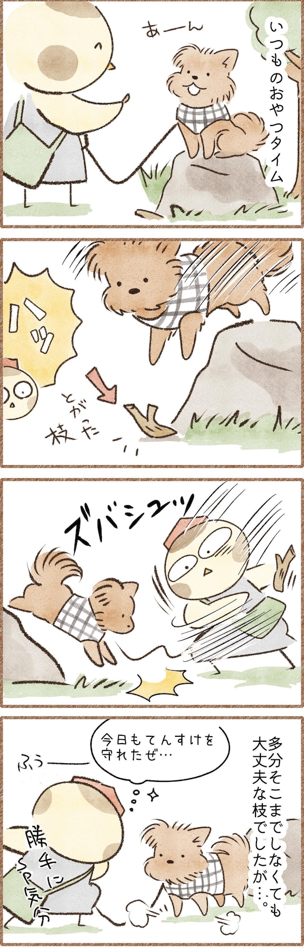 そう思った次の瞬間、私はてんすけが着地する直前に、反射的に手でバッ!と枝を払っていました。