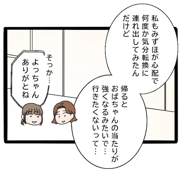 みずほ先輩が母からきつく当たられていたことを知っていたよっちゃんは、「私もみずほが心配で何度か気分転換に連れ出してみたんだけど、帰るとおばちゃんの当たりが強くなるみたいで・・行きたくないって・・」とこれまでのことを話してくれました。申し訳なさと感謝の気持ちで「そっか・・よっちゃん、ありがとね」と伝えると、