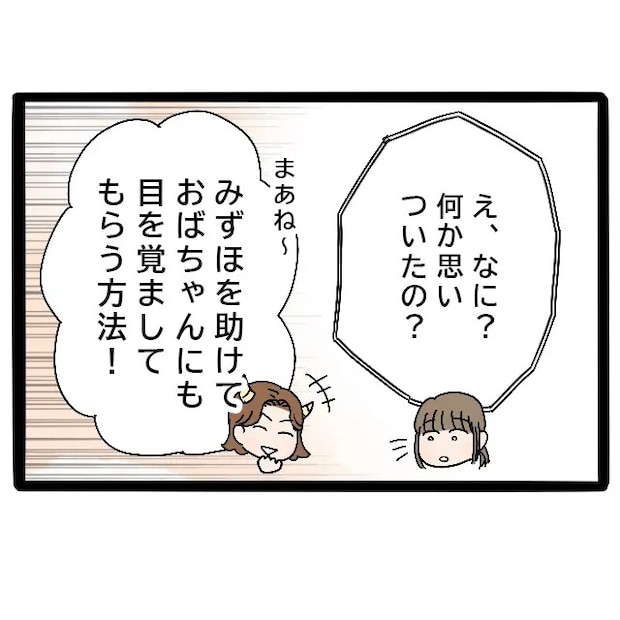 よっちゃんはすでに何か良い案を思いついたようです。「え、なに?何か思いついたの?」と聞くと、「まぁね~。みずほを助けて、おばちゃんにも目を覚ましてもらう方法!」と自信ありげなよっちゃん。