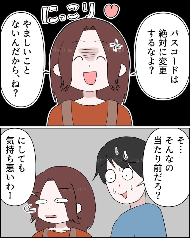 「パスコードは絶対に変更するなよ?やましいことないんだから、ね?」と念押しすると、「そ・・そんなの当たり前だろ?」と動揺しながら答える謙介。この場を切り抜けたら変更する気だったな?と思った私は、「にしても気持ち悪いわー」と、とどめを刺しておきました。